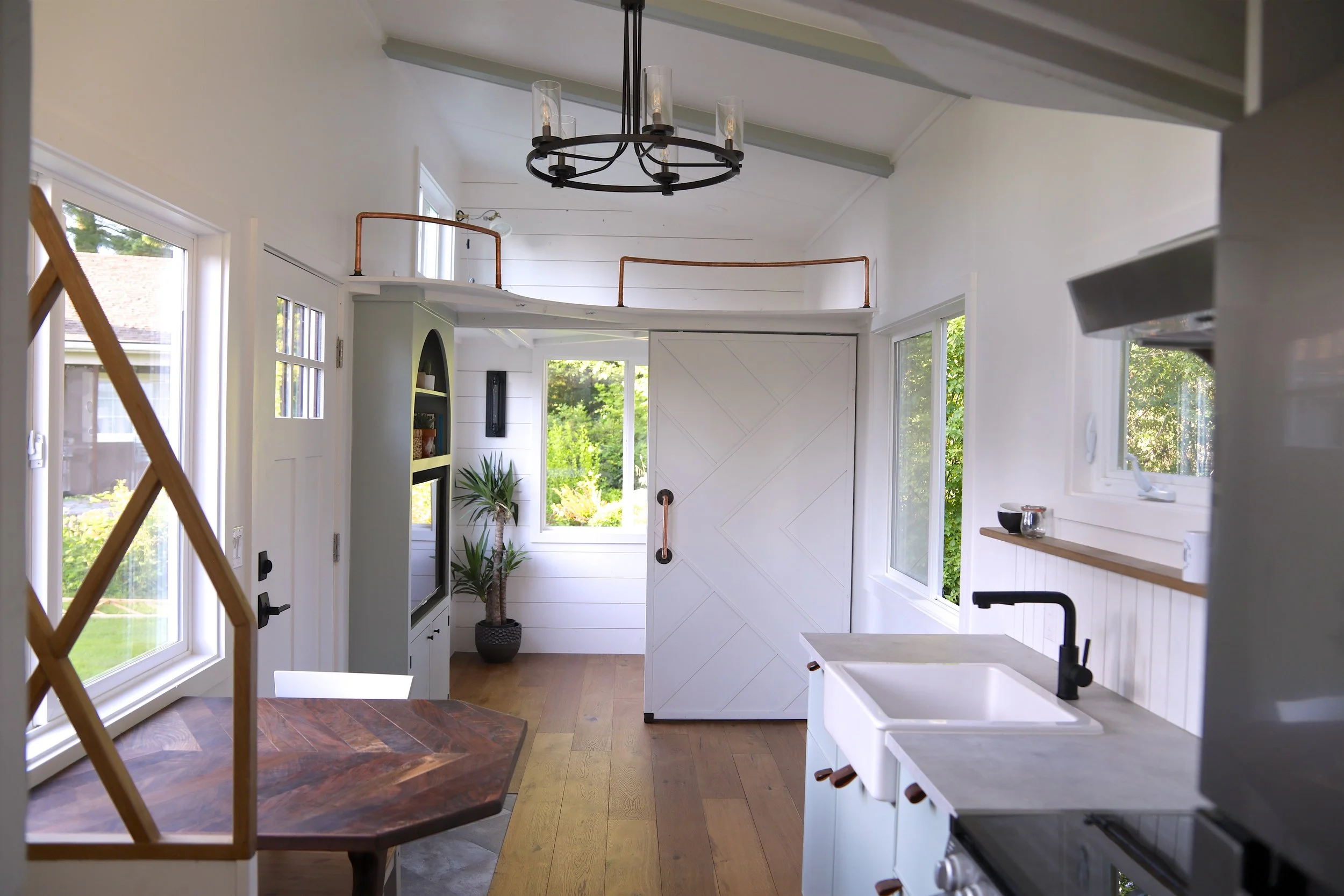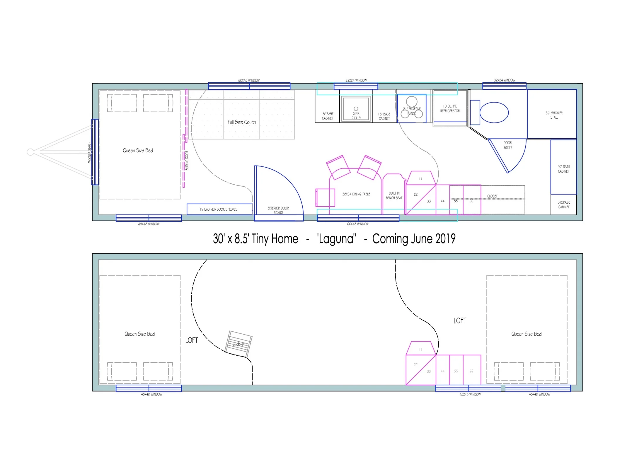 Inspired by the beautiful beach town of Laguna Beach California. It’s built on a 30’x8.5’ triple axel Iron Eagle trailer. Interior features include a downstairs flex space (bedroom or home office) a large sleeping loft in the back (accessible by stairs) and a smaller sleeping loft in the front (above the flex room, accessible with ladder), stainless steel appliances, and a Mini Split system (Air Conditioning/Heating). Exterior features include Board & Batt, matte black metal roof and painted cedar accent detail.