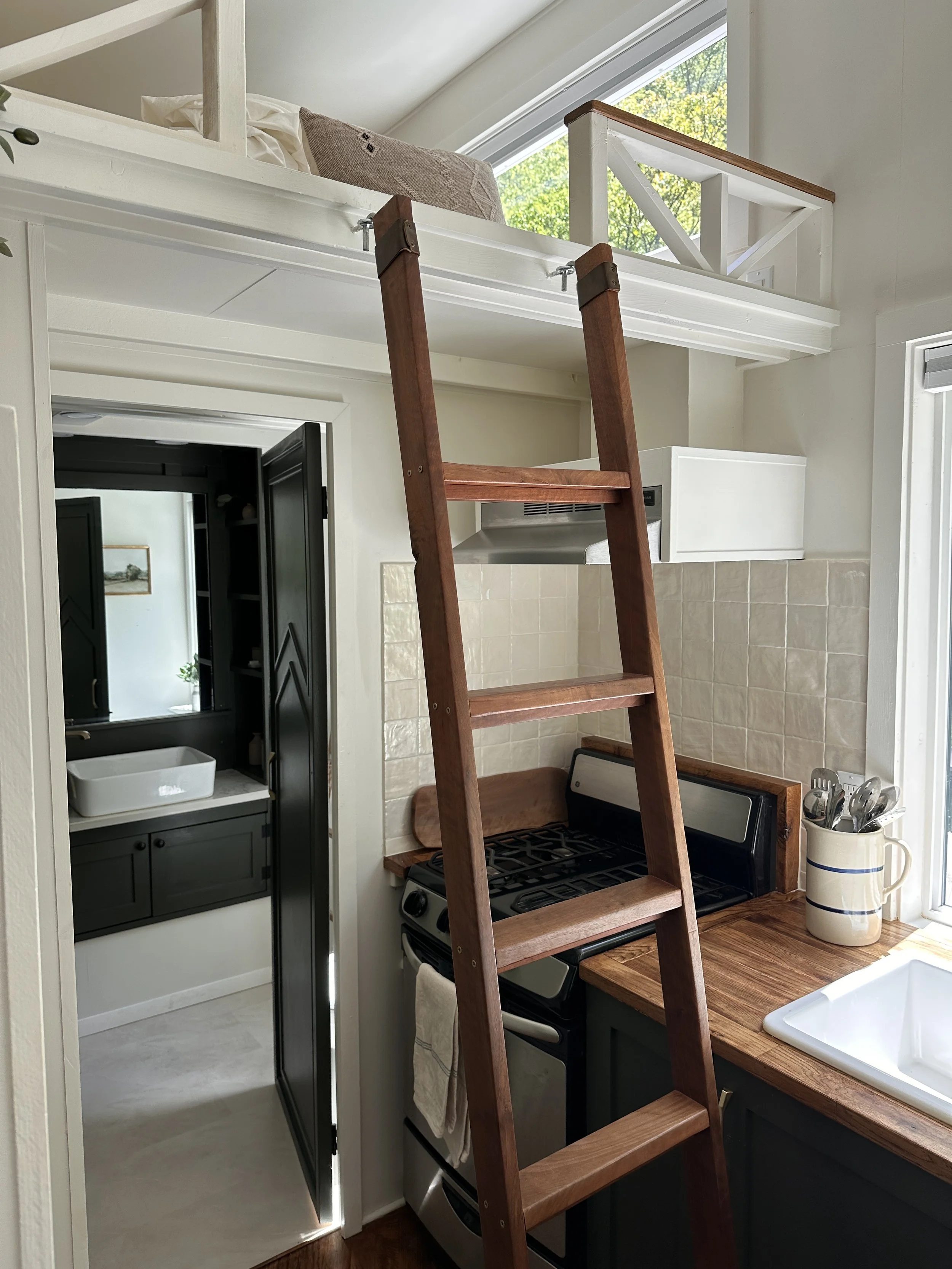 90″x92″ loft with salvaged Walnut ladder access ladder