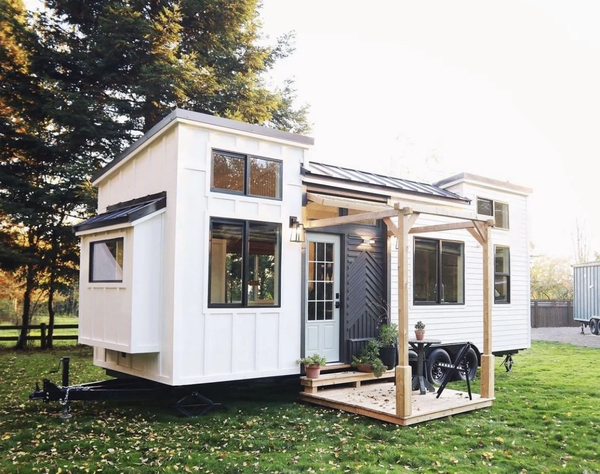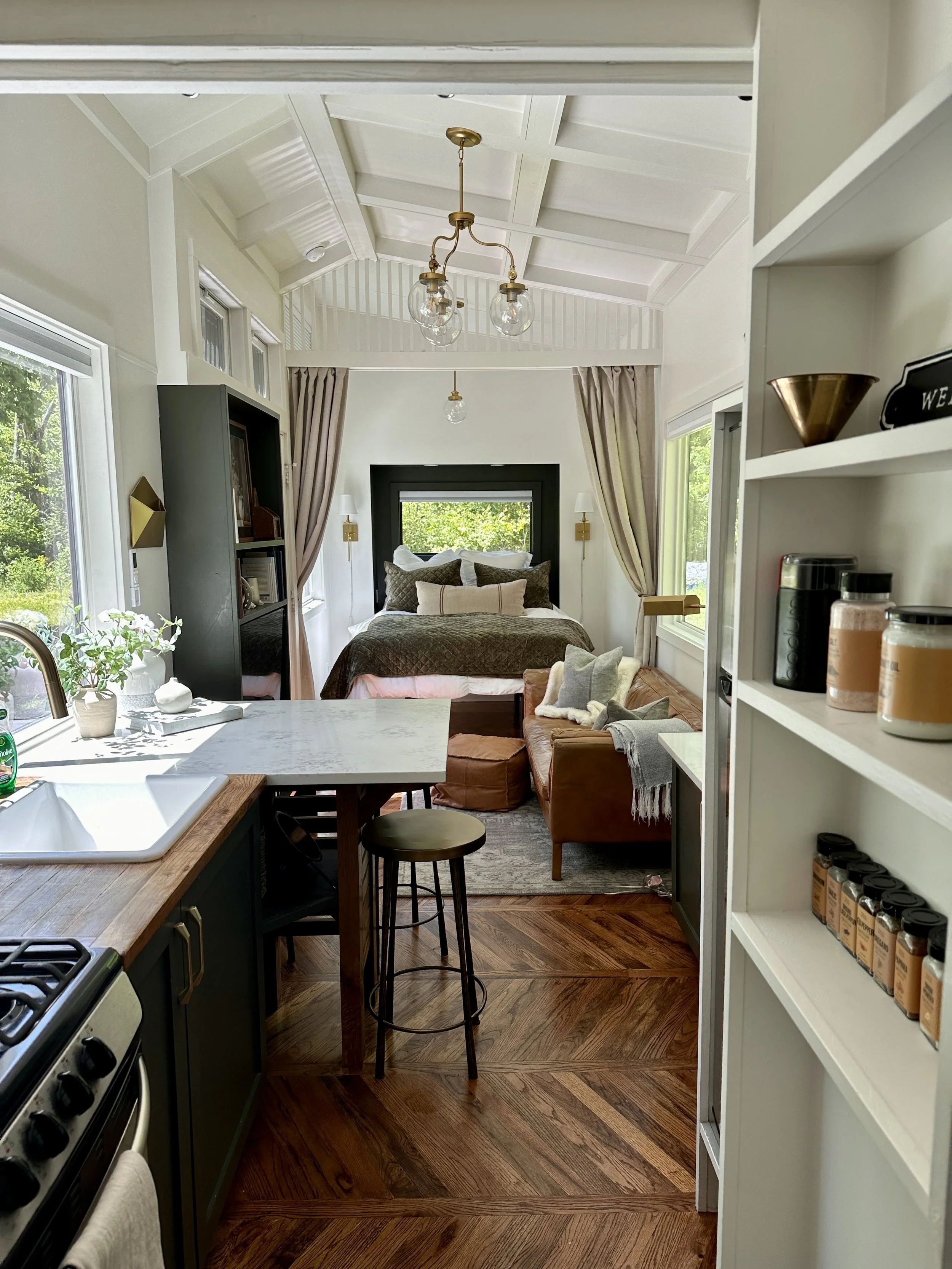 30’ x 8.5’ Tiny Home. Interior features include a downstairs flex area (could be used for bedroom or home office), a sleeping loft in the back, stainless steel appliances, and a Mini Split System (Air Conditioning/Heating). Exterior features include Board & Batt, and cedar accent details
