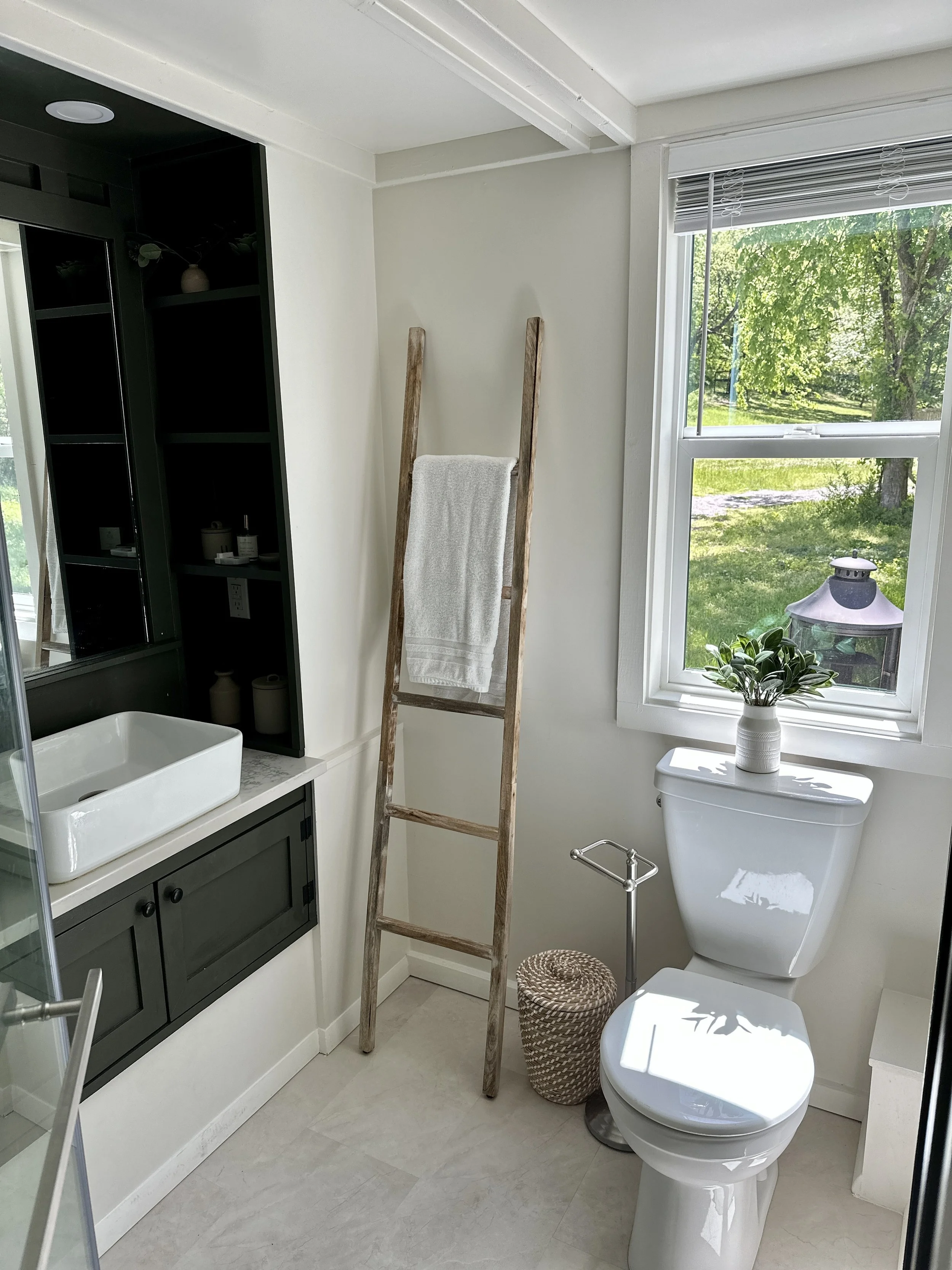 Quartz bath vanity (36" wide) with vessel sink, built-in storage space
