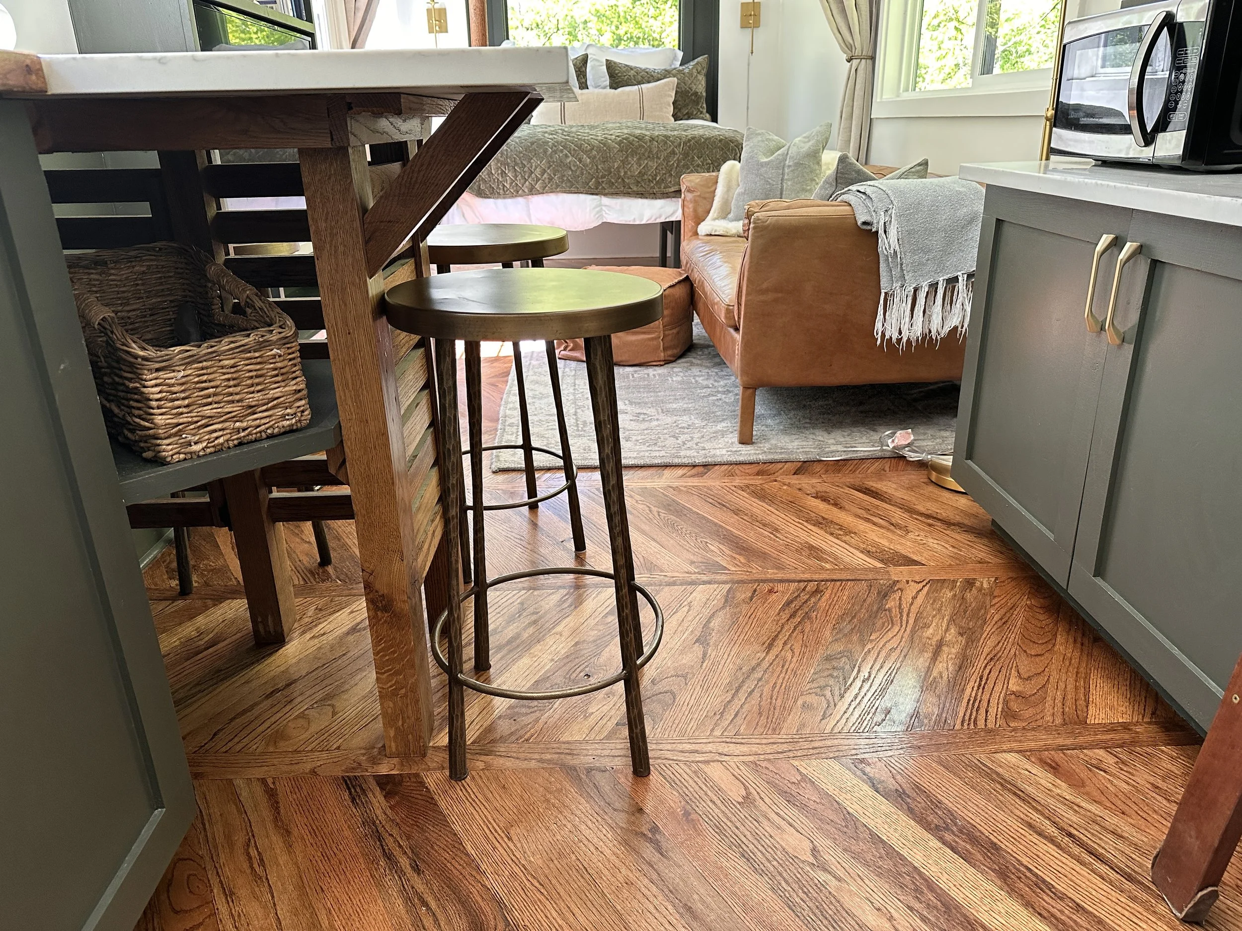 Combination of Quartz stone and Oak countertops, Solid Oak hardwood flooring in a chevron pattern